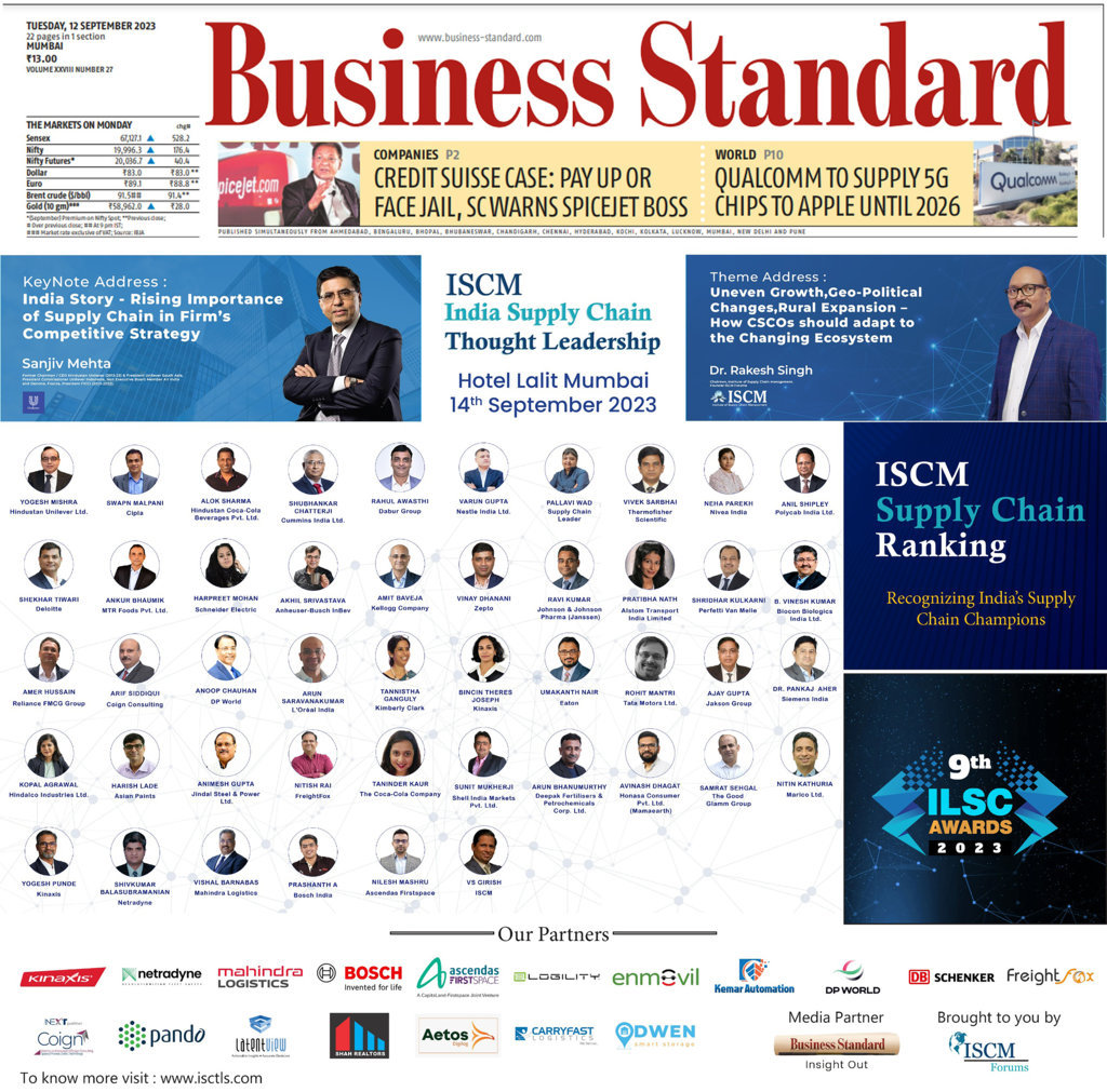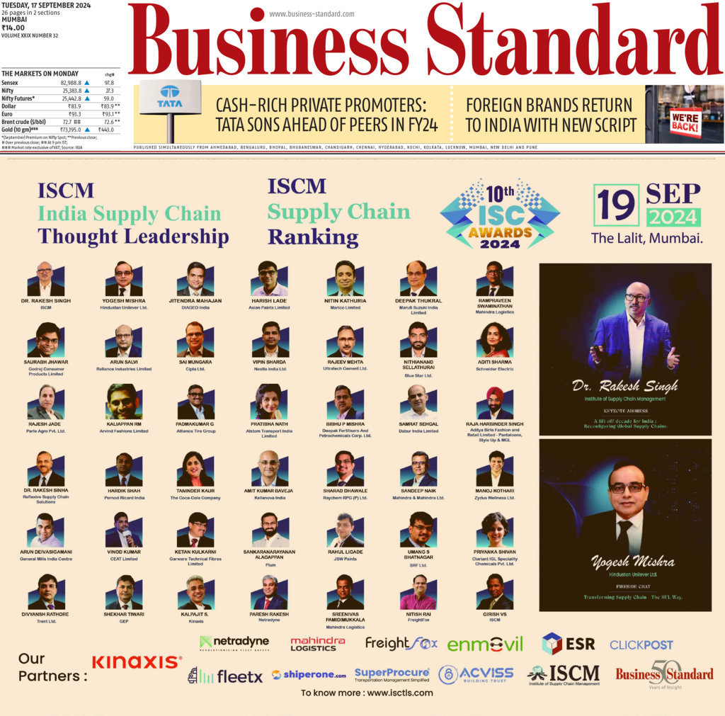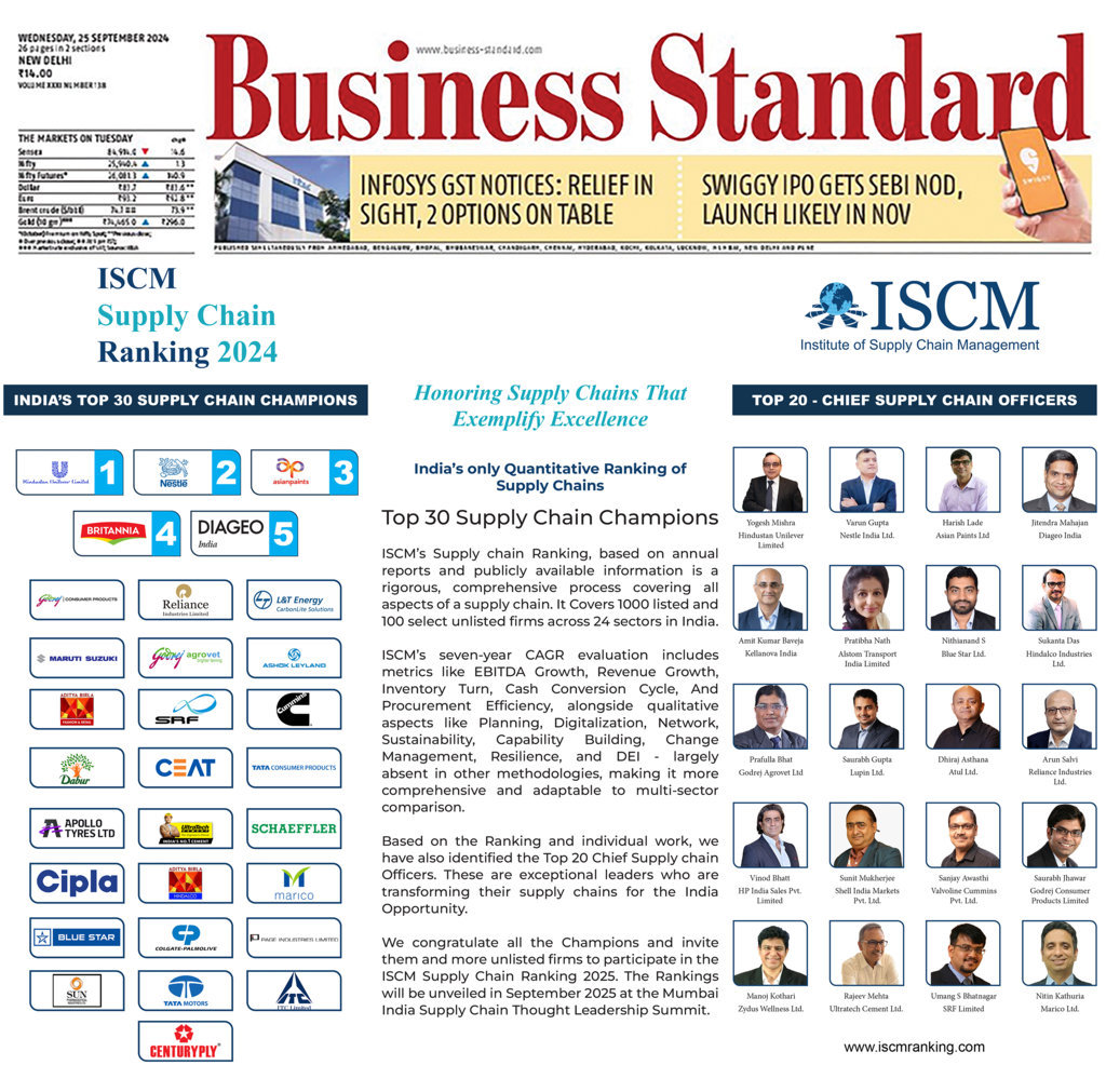 ISCM proudly announces the launch of the third edition of India’s first objective Supply Chain Ranking—Supply Chain Champions 2025! This unique platform honors companies that have transformed their supply chains into true strategic assets. Using both financial and qualitative data, ISCM evaluates organizations across 22 sectors, focusing on excellence in planning, procurement, sustainability, technology, and resilience.
